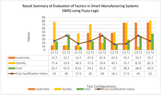 Based on the initial test setups that we configured and the test results obtained from those configuration settings, up to the engineer’s validation on the test results, we can say that the Fuzzy Logic rules that were initially configured based on logical assumptions are close to accuracy. Only one test result was disagreed with by field engineers as this would produce a high cost for final cost justification in an actual setting. From all the tests performed and achieved results, it is shown how much each of the tested indicators impacts other factors in any smart manufacturing system (SMS) configurations. Therefore, engineers in any manufacturing industry must determine the best configuration setup for any production process in the manufacturing environment. This is important as we can see that different arrangements could lead to different values for Lead time, Quality, and Cost, which would directly impact the cost justification of the final product. For example, if in any manufacturing setup where the Lead time will become high, this will affect the quality of the product and the production cost, affect the quality of the product and the production cost, and directly impact the cost justification of the final product. As shown in Figure 3 earlier, for a sample of different manufacturing setups, these will have different values for each factor. For instance, under the setup where the number of raw materials that need to be processed is higher than the number of machines and operators available to process them, the Lead time is expected to become high as the waiting time for each of the raw materials to be processed will increase, thus causing some of the raw materials to be expired and be disposed of, which will increase the production cost again, but the quality of the product itself may turn out to be low quality as it was put on hold in the queue for a more extended period. In this type of setting, the final cost justification is expected to be high as tested and shown in Configuration 3 Test 2 (C3 T2), where the Lead time and Cost are set as high value, accompanied by a low value for Quality. Therefore, any decision-making is best accompanied with actual data and visualized simulation results to assist any manufacturing industry to make the best decision for the configurations needed to produce the best and most efficient result with high-quality products and reasonable cost justification. We have tested and validated in this section that fuzzy Logic-based simulation will contribute greatly to this decision-making process. As recommended during the test results’ validation by the actual field engineers, the production line in a manufacturing company requires low lead time, good or best quality, and low production cost in order to sell the final products at a low and reasonable cost. High lead time and high production cost will increase the final cost. Therefore, initial planning for the configuration setup can also prevent lead time from being compromised, as recommended during the validation. Manufacturers should adhere to the best configuration setups to achieve the best results. The developed evaluation model can play a significant role in this decision-making process as the satisfaction rate for this model has been proven to be more than 80%, which is considered close to accuracy in the actual manufacturing world.