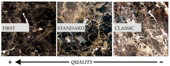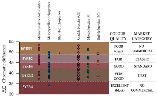 From the colourimetric analysis of the Sierra del Cuchillo samples, a series of categories were established based on the calculation of the total colour difference (chromatic difference, ΔE) factor. In the specific case of ME, the production and distribution companies establish categories and varieties based on the colour and homogeneity of the rock, the density and typology of the calcite veinlets (Figure 1). A review of the categories and qualities created by the companies in the ornamental stone sector that produces and markets ME, as well as the reports of consulting companies [15], has enabled a quality category according to colour for Marrón Emperador in southeastern Spain to be established (Table 5). Three main commercial categories of Marrón Emperador have been established, from lowest to highest quality: classic, standard and first. Out of range, and therefore not commercial, are very dark tones, practically black (with values <36), or too light, with ranges greater than 48.
