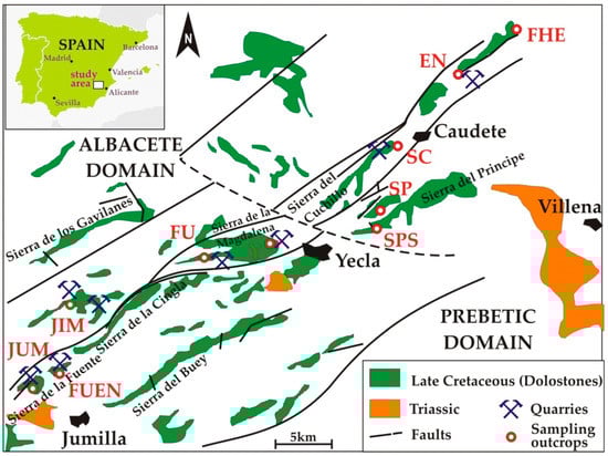 Distribution of the Late Cretaceous outcrops in the study area where extractions of the “Marrón Emperador” commercial marbles are concentrated. The Mesozoic tecto-sedimentary domains of the Betic Margin, the main tectonic accidents and the situation of the studied sampling outcrops and quarries are indicated. Northeast Sector: FHI-Fuente la Higuera (Valencia); EN-La Encina (Alicante); Central Sector: SC-Sierra del Cuchillo (Albacete); SP- and SPS-Sierra del Príncipe (Murcia); Y-Sierra de la Magdalena Este (Yecla, Murcia); FU-Sierra de la Magdalena Oeste (Murcia); Southwest Sector: JIM-Sierra de la Cingla (Murcia); FUEN-Sierra de la Fuente (Murcia); JUM-Jumilla (Murcia).
