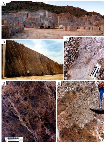 Natural ornamental stones possess beauty, durability and stability properties that have made them widely used as decorative and construction rocks throughout history [1,2,3]. There are different factors or criteria for selecting an adequate building rock, such as strength, hardness, porosity, durability or appearance. Importantly, the colour, type and size of grains/crystals, petrofabric features and the presence of “defects” (veins, joints, altered areas, etc.) have great influence on its aesthetic properties, which largely define the market value of these commercial rocks [4,5,6,7].