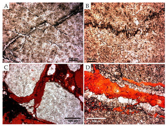 The morphology and distribution of the porous system is predominantly intercrystalline (0.01–1 mm) and bound to dissolution surfaces of clear crystallographic control. In addition to intercrystalline porosity, fissure and stylolite porosity types have also been recognised. The network of fissures, sometimes linked to venules and stylolites, is locally dense and complex, crossing or delimiting dolomitic clasts and reflecting several fracturing processes (Figure 5A,B). These fissures (mesoscale fractures) can be found partially open with openings that rarely exceed 1 mm in width. Mártinez-Mártinez et al. [19] determined that total porosity in these materials ranges between 1 and 8%, depending on the presence of fissures and the matrix content. The mean radius of the pores is greater than 2 µm. The permeability of these materials is relatively low (<1 mD) [22], reflecting a low interconnection in the porous system.