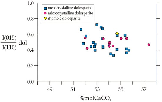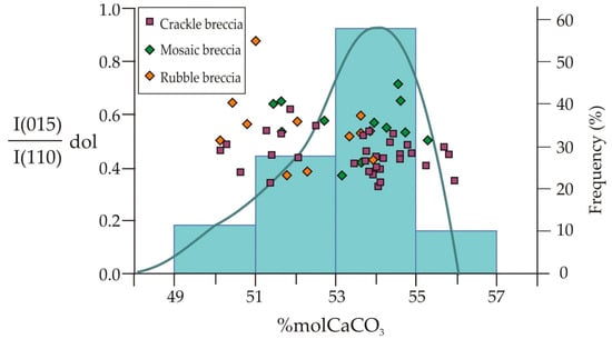 Regarding the degree of ordering of the dolomites, a direct relationship with their stoichiometry is not observed (Figure 7). The main recognised breccia types show the same variability in the degree of ordering (Figure 6), it can only be noted that the dolosparitic mosaics associated with the “crackle” breccias appear less ordered.
