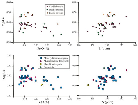 Mg/Ca vs. Fe2O3 and Sr plots from the dolostones of the main breccia microfacies corresponding to all the studied sections.