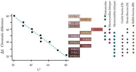 The results of the colourimetric study reveal the great chromatic variety of the samples studied. Dolostone clasts colour range in lightness (L*) from pale to dark (reddish) brown. As expected, the studied total samples have a light colour and less colour variability because of the quantities of matrix and calcite cements, with L* values between 36.9 and 51.3 (Table S3, Supplementary Materials). Lightness of dolomite clasts varies from 20.4 to 80.7 (Table S4, Supplementary Materials). With the classification of the samples according to the Munsell system, it has been possible to analyse the colour of the dolomitic clasts, avoiding the high luminosity effect of the white venules. Figure 9 shows the correlation of the two systems used by converting the Munsell categories to the L* a* b* scale, as well as with ΔE (Chromatic or total colour difference), based on the CIElab system analysed with a colourimeter.