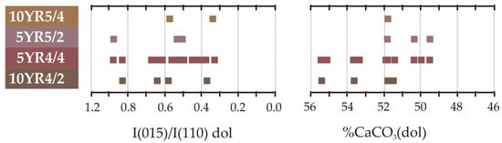 Analysing only the dolomitic clasts (different shades of brown), the spectrum of Munsell colour categories, and their equivalents in the L* b* a* scale is much larger. For example, within the browns there are darker terms (5YR3/2; 5YR2/2; 10YR2/2) that correspond to a numerically lower colour quality (chromatic difference). From the point of view of the textural types, it is observed that these darker browns correspond to mesocrystalline dolostones (Figure 9). Regarding the breccia type, no chromatic discrimination is observed. Regarding the mineralogical composition (ordering and stoichiometry) of the dolomites, there is no obvious correlation with colour (Figure 10).