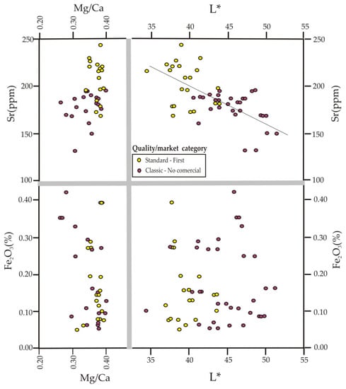 Sr y Fe2O3 vs. L* and Mg/Ca plot showing the relationship between the chemical composition of the ME dolostones and their commercial categories.