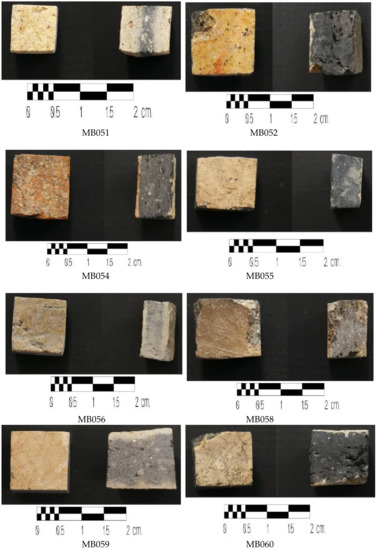 Trace elements such as Sc, V, Cr, Mn, Co, Ni, Cu, Zn, Ga, and Zr were detected using PIXE due to their contents beyond limit of detection of SEM-EDS. The contents (ppm) of Sc (3.1–77.7), V (3.8–19.5), Cr (4.9–9.1), Mn (1.8–73.0), Co (19.0–28.6), Ni (6.0–11.3), Cu (6.7–9.9), Zn (6.5–60.3), Ga (7.2–22.8), and Zr (89.1) are shown in Table 3. Mn (MB056), Zn (MB056 and MB058), and Ga (MB055) were below detection limit in some samples. Zr was only found in MB051, while Cr (MB056, MB058, and MB060), Co (MB052, MB054, and MB055), Ni (MB052, MB056, MB058, and MB060), and Cu (MB052, MB055, MB058, and MB060) were detected in some samples. Sc (MB052, MB054, MB056, and MB059) and V (MB052, MB055, MB058, MB059, and MB060) were present in some samples. These elements were trace elements in soil and clastic sedimentary rocks found in northeastern Thailand [44].
