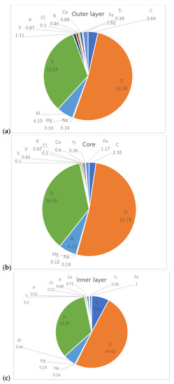 Average elemental composition of samples analyzed by SEM-EDS for (a) outer layer, (b) core, and (c) inner layer.