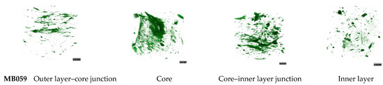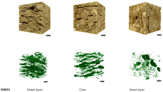 Tomographic images of MB051, MB055, MB056, and MB059 which provided visualization of internal structure (brown), and pore and crack (green). The length of scale bars located at the bottom right corner or top right corner of images is 100.00 µm.