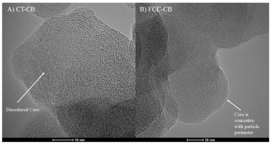 Figure 3 shows high resolution transmission electron microscopy (HRTEM) micrographs of CT-CB versus FCC-CB. The CT-CB shows a disordered nanostructure within its particles. Lamellae orientation at the core of the particle is amorphous and unstructured. In contrast, FCC-CB particle cores lack visible disorder. Lamellae appear ordered, somewhat concentric, following the orientation of the perimeter lamellae that comprise its shell.