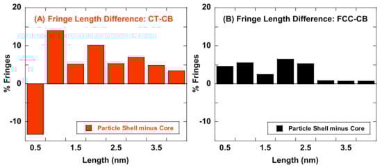 CT-CB: Figure 4A shows differences in fringe lengths of the lamellae that comprise the particle’s core and the particle’s shell. Lamellae that comprise the particle’s shell have longer (higher % > 1 nm in length) fringes relative to the lamellae that make up its core as seen by TEM and indicated here by the positive %’s for longer fringe lengths.