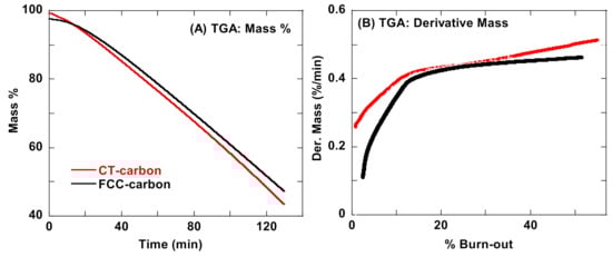 CT- and FCC-CB were treated isothermally at 500 °C in a TGA until a 50% weight loss was observed. Trends of weight loss and its derivative curve smoothed with respect to time are shown in Figure 6.