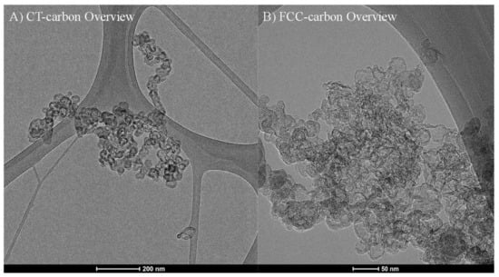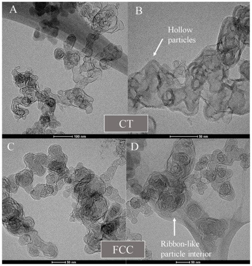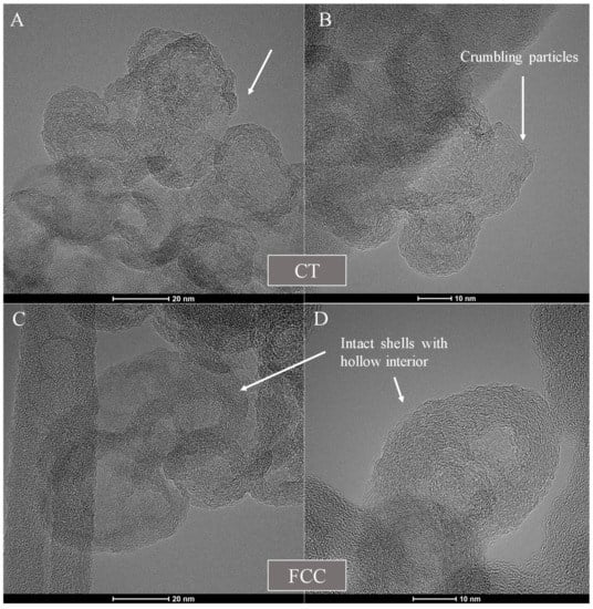 Figure 7 shows overview TEM micrographs of the two carbon blacks and Figure 8 shows HRTEM micrographs with arrows pointing towards crumbling particles in Figure 8A,B for CT-CB, while Figure 8C,D show hollowed out intact shells of FCC-CB black.