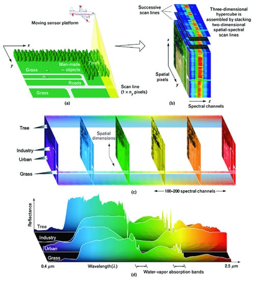 Generally, hyperspectral imaging is an incorporation of the modern imaging system and traditional spectroscopy technology [30,31]. According to Govender et al. [32], the evolution of airborne and satellite hyperspectral sensor technologies has overcome the restraint of multispectral sensors since hyperspectral sensors assemble several narrow spectral bands from the visible, near-infrared (NIR), mid-infrared, and short-wave infrared portions of the electromagnetic spectrum. The hyperspectral sensor collects about 200 or more spectral bands, each only 10 nm wide [27] which allows the construction of continuous spectral reflectance signatures while the narrow bandwidths element of hyperspectral data enable in-depth examination of Earth surface characteristics which would disappear within the relatively coarse bandwidths acquired with multispectral data. Hyperspectral data are usually assigned as hypercubes (see Figure 1) that contain two spatial dimensions and one spectral dimension, regarding the characteristics of each hyperspectral image, comprising many channels since there were bands—in contrast to grayscale or RGB images—that included only one or three channels, respectively [33].