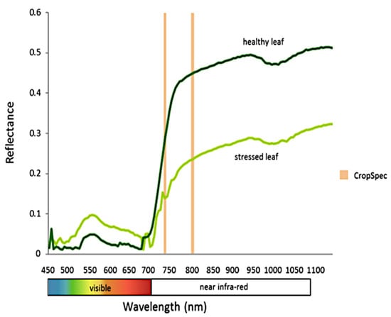 Spectral reflectance for healthy and stressed leaf in visible and NIR wavelength [59].