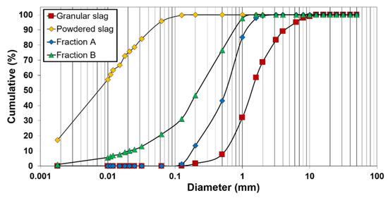 Particle size distribution of as-produced granular slag and after different pre-processing procedures. Powdered slag refers to finely milled slag used as binders’ main precursor while fraction A and B designate roughly milled slags used as small size aggregates.