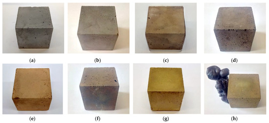 Alkali activated mortar specimens after 28 d of curing and thermal exposure to: (a) 20 °C; (b) 600 °C; (c,d) 750 °C with heating rates of 1 and 10 °C/min, respectively; (e,f) 900 °C with heating rates of 1 and 10 °C/min, respectively; (g,h) 1100 °C with heating rates of 1 and 10 °C/min, respectively. Mortars exposed to 105 °C are not shown here, but no significant modifications of specimens’ appearance could be seen relative to the ones kept at 20 and 600 °C (a). At 600 °C there were no visible differences between specimens heated with distinct heating rates, with (b) being a representative example of both. Molten material at the surface of mortars heated up to 1100 °C at 10 °C/min is illustrated in (h).