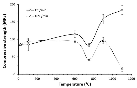 In samples heated to 1100 °C with a lower heating rate, no molten material was visible after thermal exposure. The more gradual heating process diminished crack formation, which allowed the molten material to be retained inside the monolith, positively affecting the mortars’ structural stability and high-temperature performance. Although mortars heated up to 1100 °C with heating rates of 10 °C/min retain their cubic shape and were tested for their compressive strength, they were excluded from further physical analysis (e.g., mass loss). The physical and mineralogical modifications that occurred upon heating had clear repercussions on AAMs’ residual properties. From room temperature to 600 °C a slight increase of compressive strength after thermal exposure was observed, as shown by Figure 5.