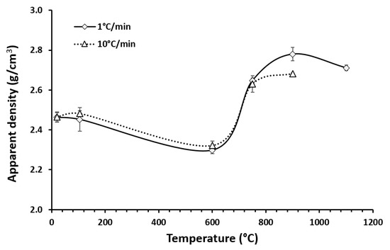 Mortars’ apparent density as a function of temperature and heating rate. The curves are drawn as a guide to the eye. Due to deformation of the samples fired at 1100 °C with a heating rate of 10 °C/min data collection was not possible.