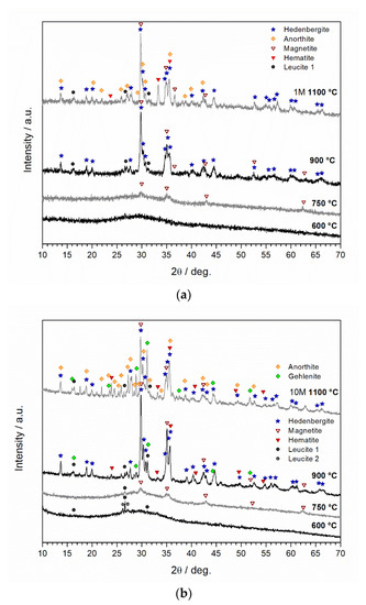 The improvement of compressive strength after thermal exposure to temperatures that do not exceed 600 °C is not related to melting and crystallization processes (see Section 3.3), but most likely to the increment of on-going polymerization reactions. In previous work [27,28], the authors have shown that in very similar alkali-activated systems, exothermic reactions have not completely ceased after more than 20 d of curing. Elevated temperatures stimulate these late-stage reactions and prompt the formation of more mechanically resistant binding phases. Along with the absence of significant crack formation, this beneficial effect overcomes the deleterious impact of dehydration and improves AAMs’ mechanical features. The increase of compressive strength in this temperature range is often associated with densification [7,29]. However, it can be seen in Figure 6 that the apparent density slightly decreases at 600 °C. Although more resistant and probably denser polymeric chains have been formed, this decrease is the combined effect of water loss and shrinkage. As mass loss (≈8.5 wt.%) was significantly higher than the volumetric contraction up to 600 °C (<2 vol%), apparent densities decrease slightly. The increment of on-going reactions is further supported by comparing the mechanical strength of samples thermally treated up to 600 °C with different heating rates. As can be seen, lower heating rates—meaning more prolonged residence time at elevated temperatures—favor the formation of more resistant AAMs without significantly modifying the samples’ mass and volume (Figure 3) or promoting the significant formation of new crystalline phases (Figure 7). At 750 °C, considerable deterioration of AAMs’ mechanical properties occurred with both heating rates. This process may be related with modifications on the iron- and aluminosilicate networks occurring even before sintering [30]. The shrinkage of the aluminosilicate network induces internal cracks and increases the mean pore size, which leads to poorer mechanical performances [30]. Nonetheless, totally dehydrated charge balance cations (Na+ or K+) act as flux at high temperatures and reduce the temperature at which melting and crystallization start. This can imply the formation of partially sintered phases at around 750 °C [26]; however, these are not fully able to compensate for the decline in compressive strength caused by dehydration-related shrinkage.