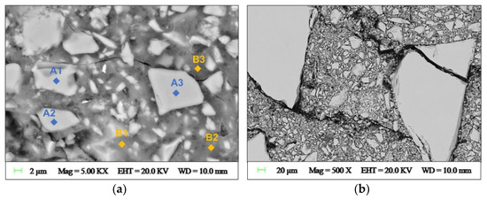 Figure 8 shows representative backscattered electron imaging micrographs of the reference mortar before being exposed to thermal treatment. A binder phase was formed (Figure 8a), but the existence of embedded unreacted particles confirms that complete dissolution was not achieved. The high solid-to-liquid ratio used (2.85) limited the precursors’ dissolution, but the samples show a homogeneous matrix in which undissolved particles acted as small-sized aggregates, (Figure 8b). Extensive microcracks have been observed with undissolved particles acting as physical barriers that limited crack development and propagation. Similar microcracks have been reported in the literature, and their origin associated with drying shrinkage processes [28]. EDS analyses revealed a binder phase predominantly composed of Si, Al, Fe, Ca, and K, while the spectrum of undissolved particles was in line with the chemical composition of the slag used as the main precursor and as aggregates (Table 3). Some spherical pores were also observed that can be attributed to entrapped air during mixing.