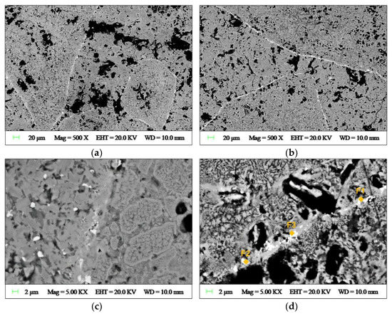 The effects of high-temperature exposure and heating rate on mortar morphology are illustrated in Figure 9. Independently of the heating rate used, a more compact microstructure with few large cracks was formed relative to the parent mortar. Partial softened aggregates have been reported to contribute to form homogenous mortars [23] and morphological analysis indicates that undissolved particles previously visible in green samples were almost completely molten (Figure 9a,b). Their previous homogeneous structure was transformed into a texture of finely exsolved phases. However, the contours of undissolved particles remain identifiable as white lines. A clearer picture of interfacial transition zones between molten aggregates and previous existing binders is better seen at higher magnification (Figure 9c,d). EDS analyses revealed the predominance of iron elements in the white areas outlining the aggregates’ contours, which suggests the concentration of oxidized iron phases at these locations (Table 3 and Figure 9d). At higher magnifications, the morphological differences between samples heated with distinct heating rates become more evident.