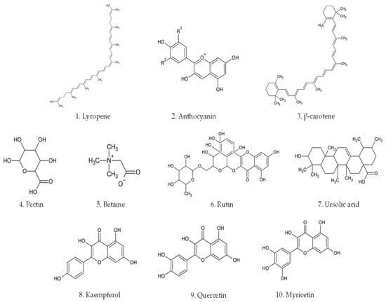 Chemical structures of 10 bioactive compounds in red-pigmented foods. The chemical structures of the compounds were generated using ACD/ChemSketch (Freeware; Ver. 3 January 2021).