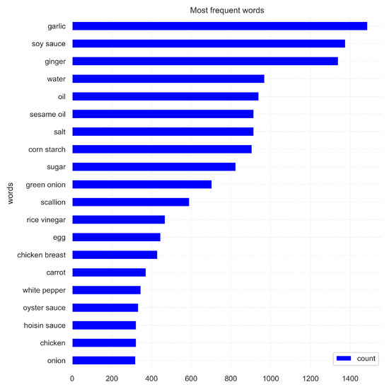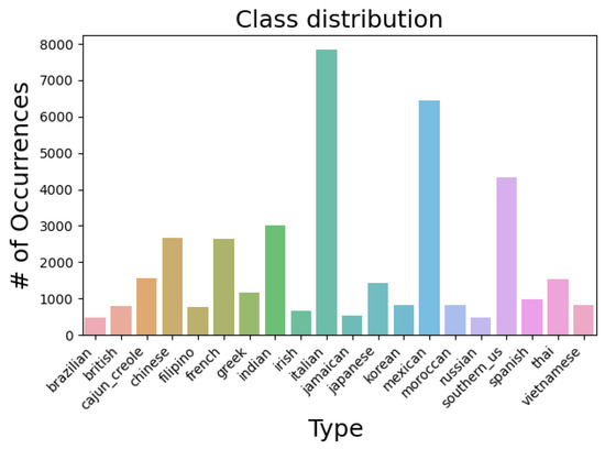 In 2014, Kaggle (https://www.kaggle.com, accessed on 27 February 2022) posted a challenge for cuisine classification. The attached dataset contains recipes with ingredients and the cuisine origin. Yummly (https://www.yummly.com, accessed on 27 February 2022) originally provided the data. The challenge consists of predicting the category of a dish by using only its ingredients. The available data is provided in the form of JSON files and include a number of different cuisines with their respective ingredients.