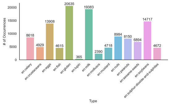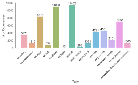 In a recent paper [16], the authors present an approach for multi-label classification of restricted foods in recipes. The 10 proposed class labels are not directly related to allergens, though some class names group foods with allergens together. The authors use an existing dataset (https://www.kaggle.com/shuyangli94/food-com-recipes-and-user-interactions, accessed on 27 February 2022), and while they do not mention preprocessing recipes, a list of 6734 different ingredients is compiled. Each word is then considered a feature and used to predict the different classes. Their proposed multi-label classification approach consists of different Random Forest Classifiers for each of the classes with a One-vs-Rest method [17]. For the evaluation, the Random Forest Classifiers are tested with a different amount of ingredients using a Bag of Word approach. Their results show that after 2700 ingredients (most frequent features), precision and recall did not improve significantly anymore. Using the Bag of Words approach, they found that by increasing the number of features, words relevant for specific classes have a bigger chance of being included in the feature set and thus improving the performance.