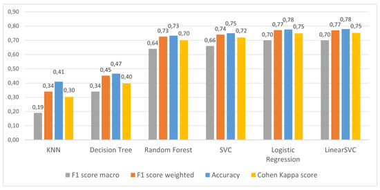 Since multi-label text classification and Stratification has been covered, allergen classification research should also be included. Alemany-Bordera et al. [20] show the use of a bargaining agents-based system to classify allergens in recipes. The authors use the United States Department of Agriculture (USDA) nutrient database [21] for additional information on ingredients in a recipe. The collaborative multi-expert system consists of several trained models. Each agent has several different binary classification models, each trained for different allergens. Additionally, each agent receives a dictionary of keywords with ingredients that contain allergens. This helps to improve the quality of the predictions. The same machine learning technique has been used to train the models. Still, each expert agent has a different model for each allergy, resulting in possibly different predictions from each agent. When a new ingredient is sent to the system, each agent uses the trained models to predict if it belongs to a certain class of allergen. The results of each agent are forwarded to another agent called the “decision-maker agent”. This last agent implements a voting system that uses the majority of votes for each class to produce a final classification. Therefore, this voting system is robust against single misclassification errors but cannot rectify the outcome if all agents produce wrong results. Their results show that the percentage for six out of seven allergen classes had improved results for the true positive rate (the probability that an actual positive class is classified as positive). However, poor performing individual agents can also bring down the overall accuracy, which can be seen in their allergen egg classification results. Here one expert has a higher true positive accuracy than the multi-agent system, which is not the case for all other allergen classes. Their results show that the multi-agent voting based system improves the overall general accuracy and increases the reliability in allergen detection for ingredients.