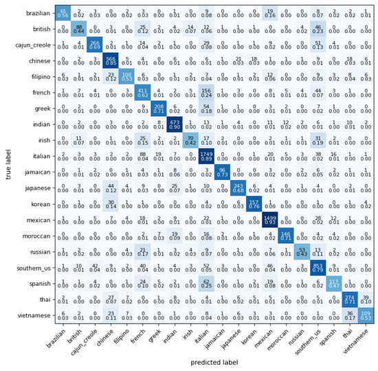 - Kalajdziski, S.; Radevski, G.; Ivanoska, I.; Trivodaliev, K.; Stojkoska, B.R. Cuisine classification using recipe’s ingredients. In Proceedings of the 41st International Convention on Information and Communication Technology, Electronics and Microelectronics (MIPRO), Opatija, Croatia, 21–25 May 2018; pp. 1074–1079. [Google Scholar] [CrossRef]