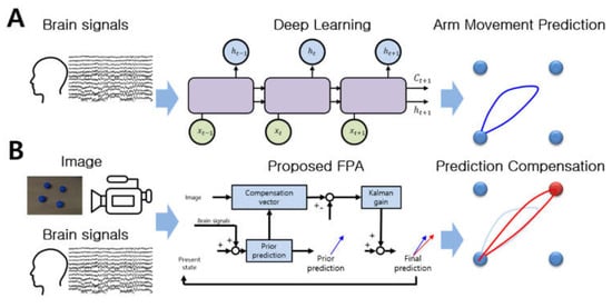 Arm movement prediction from brain signals and compensation based on image processing. (A) We developed technology to predict three-dimensional arm movement using MEG signals without surgery. (B) We proposed a novel prediction method, FPA, to increase accuracy using image information.