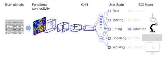 We developed a technology that could predict the user state to change the BCI type as shown in Figure 2 [28]. The user state could be estimated based on the brain’s functional connectivity and a convolutional neural network (CNN). Common average reference (CAR) and band-pass filtering are applied to EEG signals. After filtering, the system calculates mutual information (MI) among EEG signals as functional connectivity. The MI is used as the CNN input. The CNN predicts the user state into four states (resting, speech imagery, leg-motor imagery, and hand-motor imagery). Five-fold cross-validation was applied to evaluate the feasibility. The mean accuracy of 10 subjects for state prediction was 88.25 ± 2.34%. It implies that predicting user state and changing BCI mode are possible using functional connectivity and CNN.