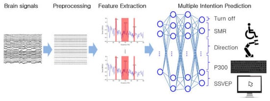 The convergence of brain science and artificial intelligence technology has received significant attention. A typical example is a brain–computer interface (BCI) [1]. BCI is a technology that can measure and analyze brain signals to predict a user’s intention and control a robot or computer according to their choice [2]. For a person to perform a movement, the brain generates a movement command and transmits it to the peripheral nerves through the spinal cord to move the body [3]. However, suppose there is a problem such as spinal cord injury (SCI) or locked-in syndrome (LIS) in these pathways. In that case, even if the brain sends a motor command, the body cannot move at all [4]. Using BCI technology, even paralyzed patients can express their intentions by typing letters. They also can drink water by controlling a robot and can drive to the desired place in an electric wheelchair [2]. BCI technology is beneficial to healthy people too. By using BCI technology, one can easily control various electronic devices such as changing the TV channel, adjusting the air conditioner’s temperature, and adjusting the music volume just by thinking without moving the body. BCI can also be utilized for games, military purposes, and the elderly. Therefore, the social and economic ripple effects of BCI technology are substantial.