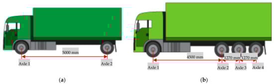 Illustration of axle configurations (schematic indication) for (a) Class 5; (b) Class 7; and (c) Class 9 trucks [26].