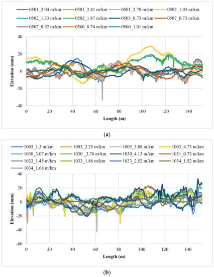 The Long-Term Pavement Performance (LTPP) program was founded to collect pavement performance data by the Strategic Highway Research Program (SHRP). The LTPP program consisted of two fundamental categories of studies, and some smaller studies to quantify specific pavement-related details that have significant influence on pavement performance. The two categories of studies are the General Pavement Study (GPS) and Specific Pavement Studies (SPS). Pavement profile data of select pavement sections in New Jersey were extracted from the LTPP database [27]. The moving average window of profile measurements was 0.3 m (0.98 ft), and the pavement surface elevation data were recorded at an interval of 0.15 m (0.49 ft). The total length of the individual pavement segment was 152.4 m (500 ft), and it consisted of 1017 surveyed points. Totally, 13 pavement profiles of five pavement sections (SHRP_ID = 341003, 341030, 341031, 341033, and 341034) on minor highways and 11 pavement profiles of five pavement sections (SHRP_ID = 340501, 340502, 340503, 340506, and 340560) on major (Interstate) highways were extracted. The measurements were conducted through 1997–2007 on the pavement sections of GPS-6S, GPS-2, and SPS-5. Figure 2 illustrates the profiles of the select pavement sections with average IRI values measured in different years. The range of IRI values of the selected major routes was 0.73–2.78 m/km (46–176 inch/mile). A wide range of IRI values from 0.73 m/km (46 inch/mile) to 4.73 m/km (300 inch/mile) was considered for minor routes. The pavement sections with similar IRI values might have totally different surface profiles, such as pavement sections of 340503, 340507, and 340560. In the pavement management system, the IRI values of 1.50 m/km (95 inch/mile) and 2.68 m/km (170 inch/mile) were usually set as the thresholds of pavement conditions ranging from fair to good and poor to fair ratings, respectively [28].