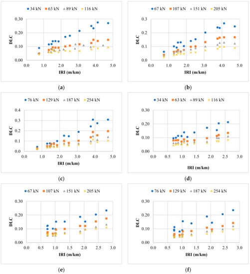 Change of DLC with IRI and axle loads: (a) single axle (minor); (b) tandem axle (minor); (c) tridem axle (minor); (d) single axle (major); (e) tandem axle (major); and (f) tridem axle (major).