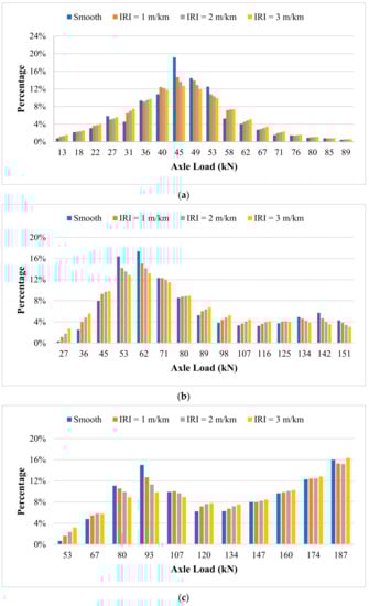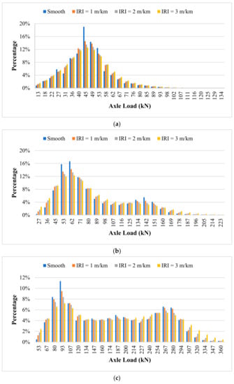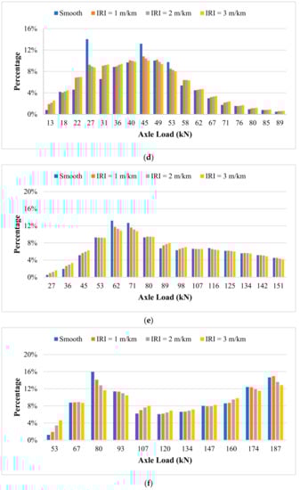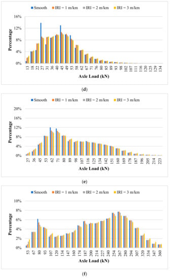 The New Jersey Department of Transportation defined 356 kN (80 kips) as the legal limit of gross vehicle weight (note 1 kip (1000 pound force) equals to 4.45 kN). The legal weights of single axle on non-Interstate and Interstate highways are 100 kN (22.4 kips) and 89 kN (20 kips), respectively. The legal weight of tandem axle is 151 kN (34 kips) [34]. WIM data were categorized into two traffic groups. The first group included trucks within the legal weight limit and overweight trucks (total traffic), while the second group only included trucks within the legal weight limit (non-overweight traffic). The considered legal weight limits on single, tandem, tridem, and quad axles were 89 kN (20 kips), 151 kN (34 kips), 187 kN (42 kips), and 240 kN (54 kips), respectively. Figure 8 presents the static and dynamic axle load spectra of non-overweight traffic on major and minor highways. The overweight weight percentages were 5.4%, 5.8%, 6.2%, and 6.5% corresponding to the scenarios of static load on smooth pavement surface and dynamic load on rough pavement surface with IRI values of 1 m/km, 2 m/km, and 3 m/km. For minor highways, the overweight percentages were 3.5%, 3.6%, 3.7%, and 3.9% when static load and dynamic loads were induced on the rough pavement surfaces with IRI values of 1 m/km, 2 m/km, and 3 m/km.