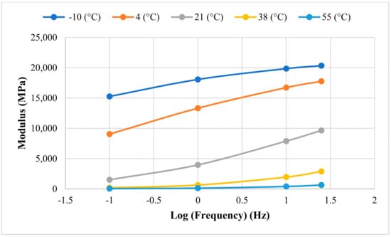Asphalt overlay is commonly used for rehabilitating asphalt pavements with or without milling part of original surface layer. In this study, two AC overlays with different thicknesses of existing AC layers (254 mm and 152.4 mm) were designed as representative pavement structures of major and minor highways in M–E pavement design. The thickness of the new AC layers was 50.8 mm. Table 2 shows the inputs of material property, traffic, and climate. Figure 5 presents the dynamic modulus of asphalt mixture in overlay at different temperatures and loading frequencies, which was set as the Level 1 input in MEPDG. The material properties of mixture in AC overlay were obtained from producer at construction, while the default material properties of mixture were designated for the existing AC layer. For both pavement structures, a 254-mm base layer and a 254-mm subbase layer were laid on the subgrade, and the typical material properties in NJ were designated for the base layer, subbase layer, and subgrade.