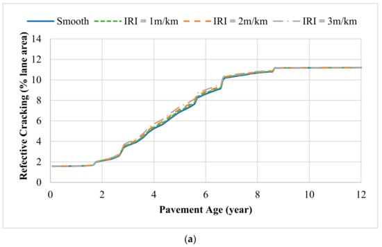 Figure 9a illustrates reflective fatigue cracking in pavement structures on major highways under static and dynamic loads of total and non-overweight traffic. Slower propagation of reflective fatigue cracking was observed when dynamic loads were considered because of the exclusion of heavier axle loads in a non-overweight traffic scenario. The exclusion of dynamic overweight axle loads decreased reflective fatigue cracking when dynamic loads were considered. However, the terminal percentages of reflective cracking under total and non-overweight traffic were identical due to the dominant role of existing cracking in cracking development in pavement overlay design. Figure 9b presents reflective fatigue cracking in pavement structures on minor highway under static and dynamic loads of total and non-overweight traffic. Taking into account the fact that dynamic axle load spectra accelerated pavement distress under total traffic and decelerated pavement distress under non-overweight traffic, the impact of overweight traffic on pavement distress would be significant when dynamic loads are considered. It suggested that the negative influence of overweight traffic on pavement distresses was underestimated if static axle load spectra were applied in M–E design.