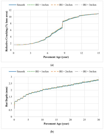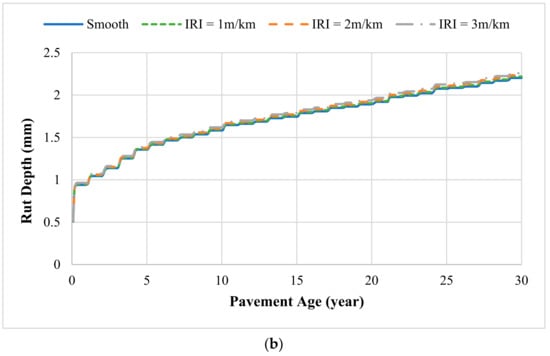 In M–E pavement design, reliability is a combined indicator of probability that each performance measure will be less than a specific level over the analysis period [1]. The reliability level of 90% was considered in the analysis. In the M–E analysis, initial IRI values were assumed to be 1 m/km (63 inch/mile) for both types of highway, and the terminal IRI values at the 20th year of service period were found to be 2.25 m/km (142 inch/mile) and 2.32 m/km (146 inch/mile) for major and minor highways, respectively. When the initial IRI was 2 m/km (126 inch/mile), the terminal IRI values at the 20th year of service period were 3.97 m/km (250 inch/mile) and 4.03 m/km (254 inch/mile) for major and minor highways, respectively. Besides, the initial IRI was found to have no influence on the propagation of pavement distress, except for terminal IRI value. Therefore, the IRI values of 1 m/km, 2 m/km, and 3 m/km, which included a reasonable range of IRI values during pavement service period, were applied to derive the dynamic axle load spectra and evaluate the effect of dynamic loads on pavement distresses. M–E outputs indicated that dynamic loads increased IRI, rut depth (total and AC only), and fatigue cracking (reflective) during the pavement service period. The effect of dynamic loads on reflective fatigue cracking was relatively more significant.