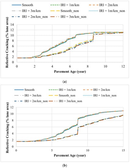 Fatigue cracking (reflective) of (a) major highway and (b) minor highway under total and non-overweight traffic (10% existing cracking).