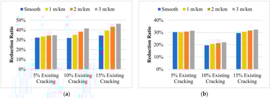 Since the terminal rut depth at the end of design life was much smaller than the recommended values as shown in Figure 6b and Figure 7b, the pavement service life determined by rut depth and corresponding reduction ratio due to dynamic loads were not considered in this study. Figure 10 shows the impact of overweight traffic on the reduction ratio of pavement life, considering different percentage of existing fatigue cracking in the AC layers. The considered threshold of reflective fatigue cracking was 5%. The analysis results indicated that the dynamic axle load spectra increased the impact of overweight traffic on reflective fatigue cracking, and the pavement structure on major highway tended to be more sensitive to overweight traffic loading. One of the reasons would be greater DLC values corresponding to the higher operational speed on major highways. Pavement service life was found to reduce as existing fatigue cracking increased, and the reduction ratio of pavement service life increased as existing fatigue cracking increased. The effect of existing cracking had a more significant impact on the pavement structure of major highways. The service life of the pavement structure with 15% existing fatigue cracking was reduced by an additional 12%, which increased the reduction ratio of pavement life up to 46%.