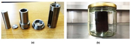 Soil sample preparation: (a) soil compaction mold used for soil remolding and (b) sealed glass jar with a soil sample to reach the degree of saturation.