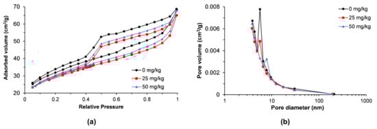 One of the aspects that affect the ψm is the capillary forces (i.e., the pore size distribution) []. Thus, porosimetry tests were performed to evaluate the suction changes for the natural soil (0 mg/kg) and the arsenic-contaminated soils (25 mg/kg and 50 mg/kg). The results of porosimetry are shown in Figure 3a, which relates the relative pressure and adsorbed volume. According to the International Union of Pure and Applied Chemistry (IUPAC, Research Triangle Park, NC, USA), these results indicate a type IV isotherm with a hysteresis type H3 characteristic of mesoporous solids, such as clays and solid aggregates, related to parallel plates, respectively.