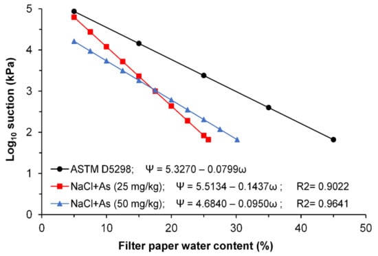 The Whatman Grade 42 filter paper calibration curves are shown in Figure 4. The suction values for the contaminated soils obtained from the calibration curve clearly show that the slope change due to the soil–water–contaminant interaction. The data obtained in the arsenic calibration curves validated the assumption that the suction values change due to the exchange of vapors resulting from the chemical contamination. Moreover, those results provided the data to support the evaluation of total suction in the arsenic-contaminated soils where the ψo has a significant change compared with its value in the natural soil.
