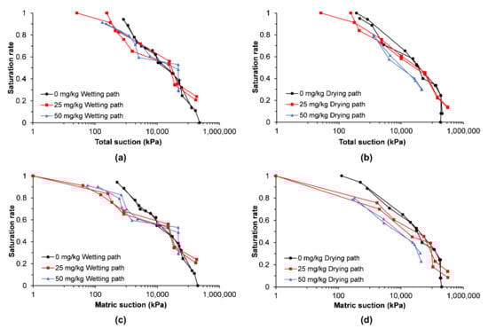 In the arsenic-contaminated cases, the total and matric suction values decreased at a high saturation rate and the slope appears to be smoother than the one observed for the natural soil condition, which is evident after comparing the wetting paths because the soil behaves as a coarse-grain one when contaminated.