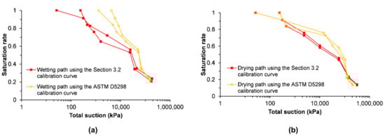 Moreover, the SWRC for both the wetting and drying paths of the 25 mg/kg arsenic-contaminated soil was evaluated to verify whether the ASTM D5298 [] calibration curve gives similar results to those obtained with the calibration curve of Section 3.2 for the filter paper Whatman Grade 42. From Figure 6, it can be seen that the ASTM D5298 calibration curve provides higher total and matric suction values for the contaminated soil.
