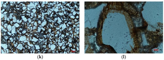 Microfacies analysis of thin sections of rock samples. (a) Carbonate A: bioclast. (b) Carbonate A: foraminifera. (c) Carbonate B: coral. (d) Carbonate B: calcite filled. (e) Carbonate C: coralline algae. (f) Carbonate C: microbial erosion. (g) Carbonate D: crystal calcites. (h) Carbonate D: dissolved pores. (i) Carbonate E: coral. (j) Carbonate E: dolomitization. (k) Sandstone S: sedimentary particles. (l) Sandstone S: oxidation zone.