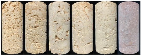 Five different samples of the reef limestones, all of which were marine biogenic carbonates, were chosen for study in the present work. To obtain the samples, a single drilling was performed on the Nansha Islands in the South China Sea. After segmentation, the drill cores at five different depths were chosen and morphed into standard cylinders with a diameter of 50 mm and a height of 100 mm through cutting and polishing. The five samples were labeled as A, B, C, D, and E according to their depth of sampling. For comparison, an extra cylindrical sample was made out of a sandstone, which is terrigenous sedimentary rock. The extra sample was labeled as S. Figure 2 shows the test samples in the present work. The machining accuracy regarding the dimensions of the samples met the requirements of the International Society for Rock Mechanics []. Table 1 lists the dimensions and densities of the rock samples.